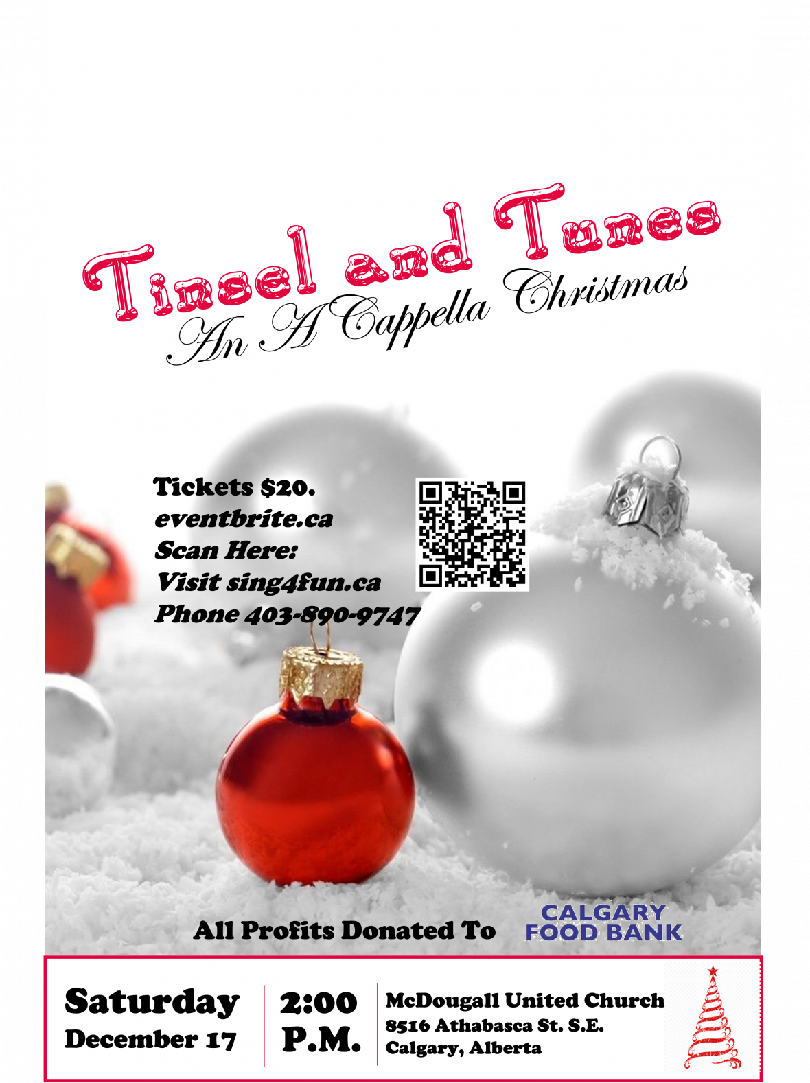 Tinsel and Tunes Christmas Show Basic event infoEvent date: Dec 17 2022 - 2:00pm to 3:45pmLocation: McDougall United Church 8516 Athabasca Street S E T2H 1S1 Calgary , AB Canada See map: Google Maps Alberta CA Public event fieldsPublic attachments: Christmas Concert Poster - Final.pngCelebrate the holiday season with 'Tinsel and Tunes', an A Cappella Christmas Celebration. This is a benefit show with all profits to be donated to the Calgary Food Bank! Hosted by Acappella Road chorus, the concert will feature 6 choruses and assorted quartets representing the Calgary Barbershop music community singing holiday favourites and carols. We welcome Pitch Please, Stampede City Chorus, Rhythm of the Rockies, Chinook Winds Show Chorus and Alberta Gold Chorus as we share our love of singing a cappella. With a mass chorus finale of all voices and an opportunity for you in the audience to sing along with a few popular melodies this promises to be a musical highlight of the season. Join us a McDougall United Church and together let us lift our spirits to welcome in the holidays. Tickets are available from members of all of the participating choruses, and from eventbrite.ca (search Acappella Road) or using the QR code on our poster, or through this website under 'Events'. We look forward to seeing you there.